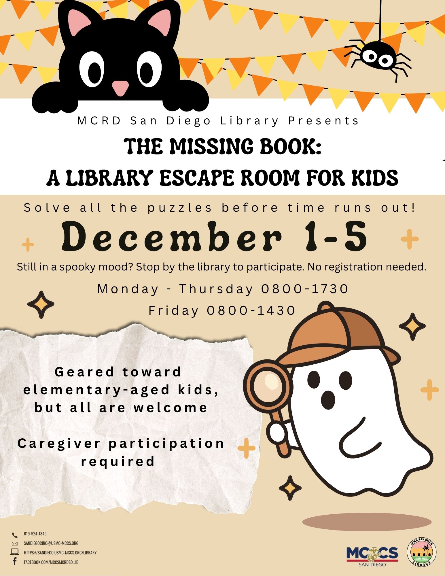 Still in a spooky mood? Stop by the library to participate in an escape room and solve at the puzzles before time runs out! Geared toward elementary-aged kids, but all are welcome. No registration needed.